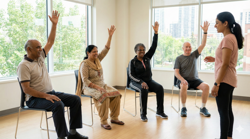 Fitness, mobility, fall-prevention activities, and wellness sessions tailored to cultural expectations and physical ability levels.